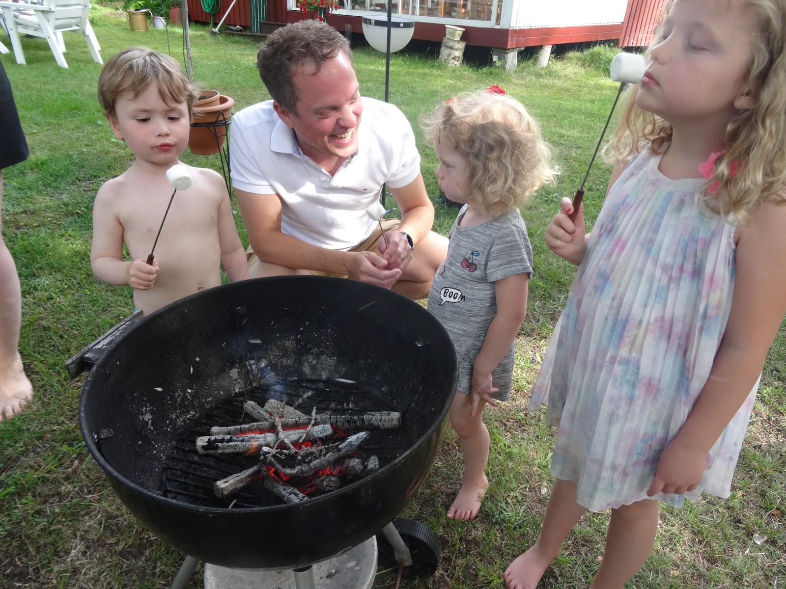 Sigge drog med sig Cajsa och Emil ner till oss vid stranden. Visst börjar han bli stor nu? Och mjölktänderna lossnar en efter en. Cajsa och Emil fick fikabröd utan problem, själv var han tvungen att sitta vackert innan det bjöds något.